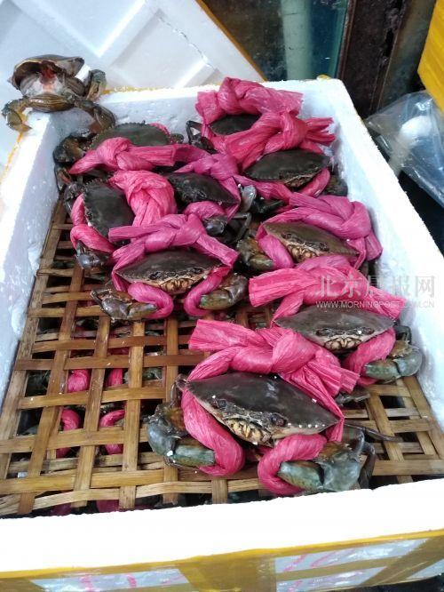 北京晨报记者来到网友反映的朝阳区大洋路海鲜市场,在大厅外的个体商户内售卖的多为湖蟹,螃蟹体型较小,分不同重量按只售卖,并没有看到螃蟹绑着夸张的绳子。