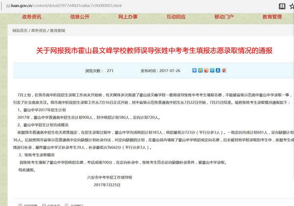 《关于网报我市霍山县文峰学校教师误导张姓中考考生填报志愿录取情况的通报》