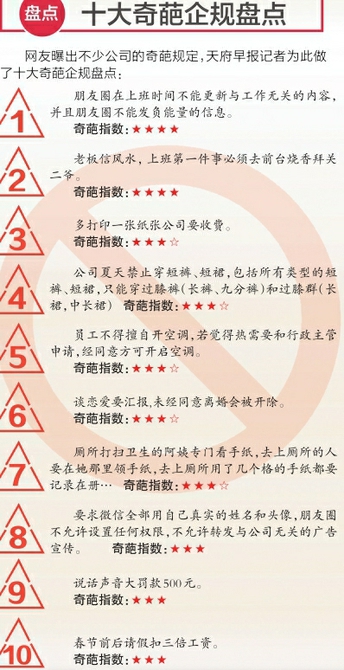 近日,一则女员工因开车未系安全带遭老板罚“上墙”的照片流传网络,虽然经查实,是去年9月份发生的事件。但是该照片还是再度引起了公众对奇葩企业规定的热议。现如今企业文化越来越多元化,各种奇葩规定层出不穷,例如近期网上被爆的因业绩未完成遭轮流掌掴、被领导浇冷水、被要求自扇巴掌……有网友质疑这种“狼性管理方式”除了践踏员工尊严外,还有些违法。那么,我们身边又有哪些奇葩的企业规定?一位职场新兵向天府早报记者讲述了他所遇到的“狼性团队”的管理。