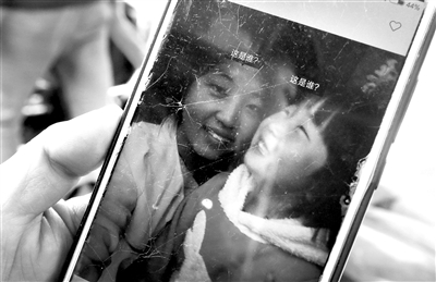 谷小芳与女儿的合影,手机上有多处裂痕,明显能看出不是一次摔出来的