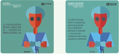 世界卫生组织在近日发布的《国际疾病分类》第十一次修订本中,将游戏障碍列入成瘾行为障碍。图为中英文版本宣传图。来源:世界卫生组织官网