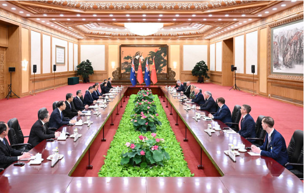 习近平强调,中新双方要把合作放在双边关系中更加突出的位置,发挥互补优势,深化贸易和投资合作,挖掘科技创新、应对气候变化、基础设施等领域合作潜力,加强教育、文化、青年、民间、地方交流,丰富双边关系内涵。中新之间没有历史恩怨纠葛,没有根本利益冲突,要相互尊重、求同存异,正确看待和处理两国差异和分歧。今年是世界反法西斯战争胜利80周年和联合国成立80周年,作为战后国际秩序的建设者和维护者,中新两国要共同捍卫以联合国为核心的国际体系,维护以世界贸易组织为核心的多边贸易体制,共同维护国际公平正义,推动国际秩序朝着更加公正合理的方向发展。