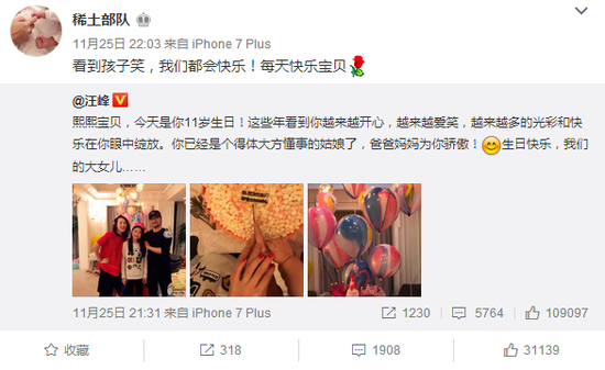 25日,汪峰曾在微博晒出他与章子怡及小苹果的合照,祝福女儿11岁生日快乐,称“这些年看到你越来越开心,越来越爱笑,越来越多的光彩和快乐在你眼中绽放…爸爸妈妈为你骄傲!”随后,章子怡转发汪峰微博,写道,“看到孩子笑,我们都会快乐!”