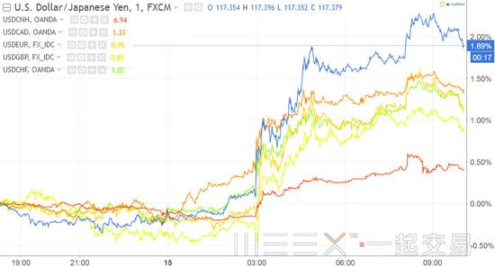 相较之下,人民币依然是最“抗跌”的币种之一。据数据分析图(见下图)显示,15日凌晨宣布降息后,日元对美元跌幅最大(下图蓝线),而离岸人民币跌幅最小(下图红线)。