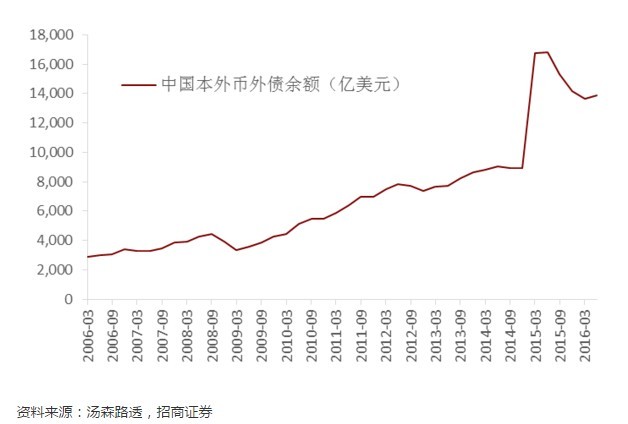 “811汇改”后,特别是今年以来,人民币汇率加大了双向波动,在市场打破单边升值预期下,许多企业加快了偿还外债的步伐,并减少对外负债,使得外债去杠杆进程告一段落。数据分析可以发现,2015年下半年以来,中国本外币外债余额下降3156亿美元。(见下图)。对外资产负债结构的调整使得我国市场主体能够更好地应对美联储加息,也有利于防范相关风险。