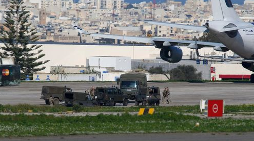 路透社照片:马耳他军方包围被劫飞机。