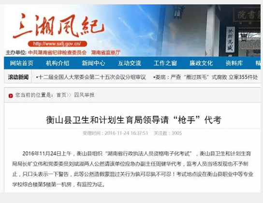 从衡山县纪委监察局对举报帖的调查处理结果看,2016年11月24日上午8:30,在衡阳电大衡山分校考点进行的“湖南省行政人员执法资格电子化考试”中,报考人员衡山县卫生和计划生育局局长旷立伟未到场参加考试,该局法规监督股股长赵水平擅自安排局应急办副主任周健华代替旷立伟参加考试。周健华代替旷立伟考完后,分别到该局党委委员刘斌淑、黄清明二名报考人员处操作电脑考试界面。