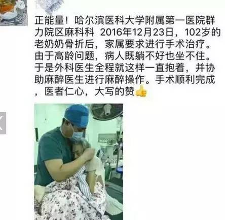 据哈尔滨医科大学附属第一医院一个网名为七一从文的医生介绍,接受手术的患者今年102岁,不小心跌倒而造成了右侧股骨粗隆骨折。由于是高龄患者,老人的家属托人找到其他医院联系住院,但其他医院表示如此高龄老人,手术风险太大,无法收入院。