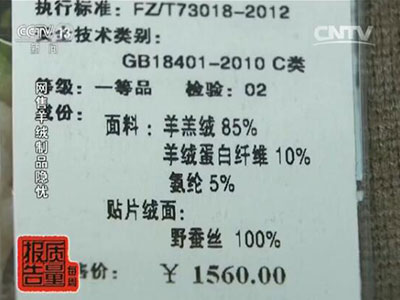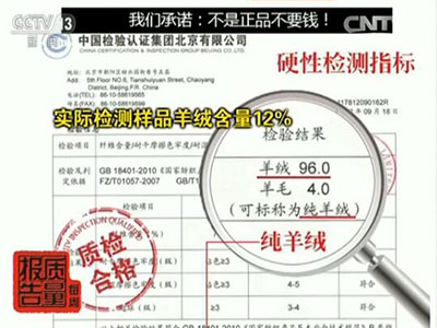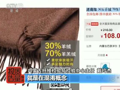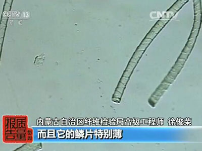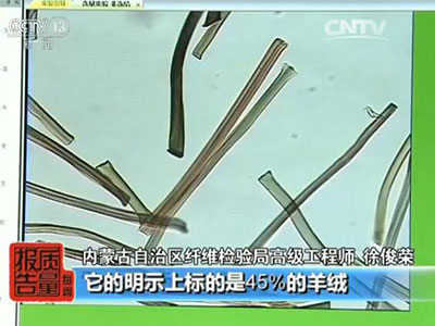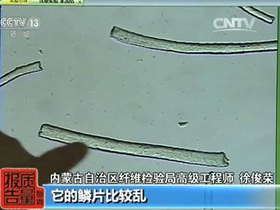 内蒙古纤维检验局高级工程师 徐俊荣:这60个不合格样品主要问题是以次充好,以假充真。比如有的号称百分之百山羊绒,我们检出来是百分之百羊毛,还有的标有百分之百山羊绒,检后发现里头一根绒都没有,有这样的情况。