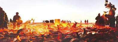 一切准备就绪,满怀丰收渴望的“查干淖尔渔夫”就等湖面冰层的一天天加厚了。在零下20摄氏度左右的环境下,结冰后的湖面冰层一般都会以每天平均1厘米-2厘米的速度凝结,而且这种在低温下迅速凝结的冰层结构密度很大,承载力很强,百姓俗称“横茬冰”。在中国北方流传着的“宁走横冰一寸,不走竖冰一尺”说的就是封冻之时的冰是“横茬”,很坚硬,具有一定的安全性;初春时的冰层疏松俗称“竖茬冰”,冰层看着很厚,其实承载力很弱,人马行走在上面很容易塌陷。因此,湖面的冰层厚度达到40厘米左右了,几十挂大车、几十张爬犁就载着数百名豪气冲天的“查干淖尔渔夫”驶向大湖的深处开始一冬的忙碌,撒下大网,收获着一冬的祈盼与希冀。