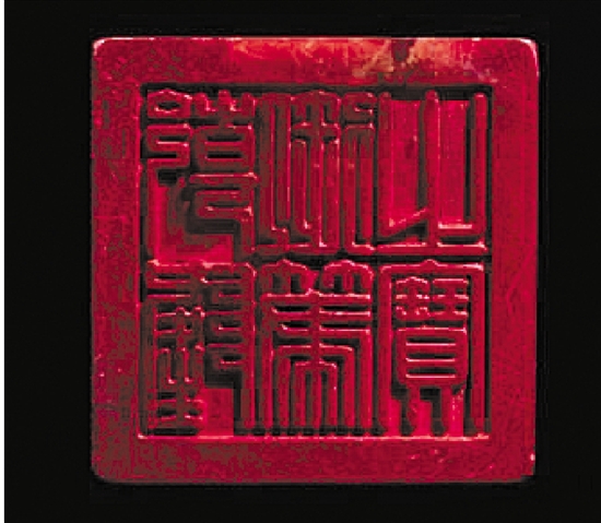 这枚皇家御玺四周浅浮雕夔龙纹,印章上部巧雕九龙腾飞于祥云间追逐宝珠的生动造型。在中国传统文化中,九代表阳气最盛,而龙则寓意皇家至尊。事实上,明、清两代是中国印章文化的鼎盛时期。清朝十二位帝王中,无论质量数量,都以乾隆宝玺为最,其一生共制印玺1800余枚,其中佚失700余枚,1000余枚现藏于北京故宫博物院。