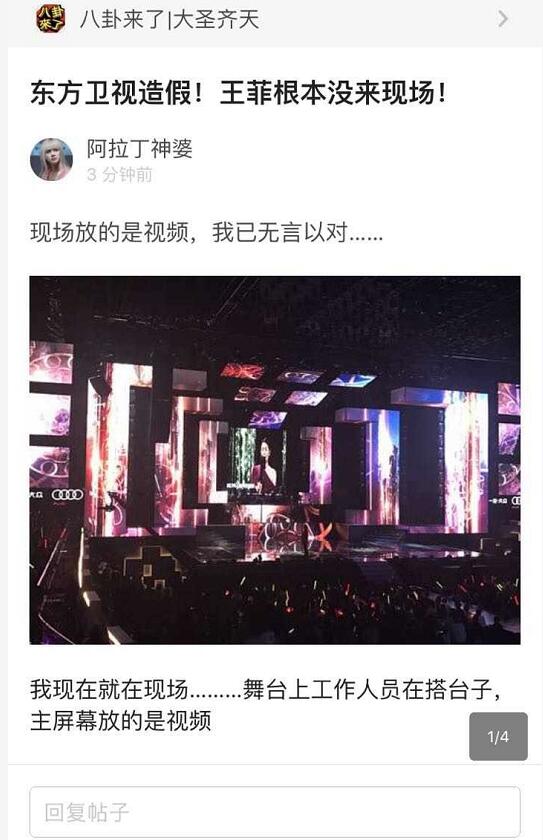 而在当晚播出的画面中,王菲演唱了新曲《你在终点等我》与《人间》两首歌曲,不过据现场观众爆料,王菲其实根本没有来到现场,现场观众看到的只是大屏幕中录好的画面。