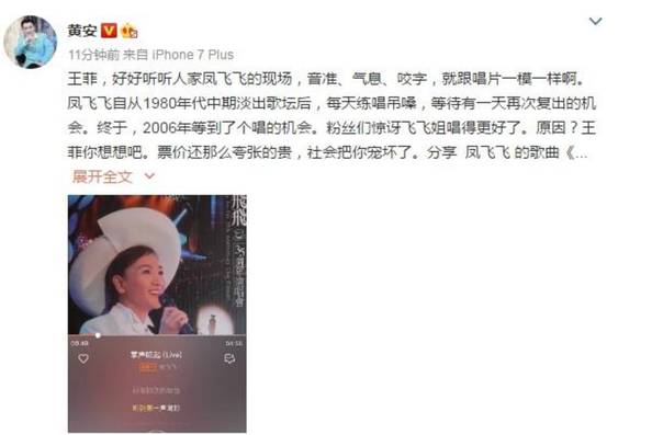 这不黄安也在微博上点评了王菲的这次演唱会的失常,不仅拿凤飞飞拿出来做榜样,直言凤飞飞淡出歌坛后每天还在吊嗓子练习,结果再次开演唱会时,居然唱的更好了,反观王菲呢!弄了一个天价门票却唱歌走音。直言她被社会宠坏了。