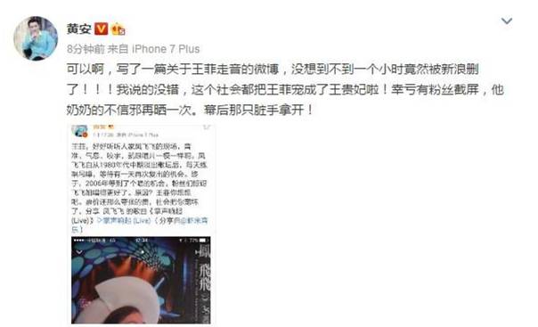 这不黄安很中肯的点评却被新浪删文,随后再发微博,并附上截图。还直言幕后的脏手拿开。看来王菲的团队不简单啊!都可以随意删文了,这让小妹想到了中青网的那次关于赵薇的文章被删一事。
