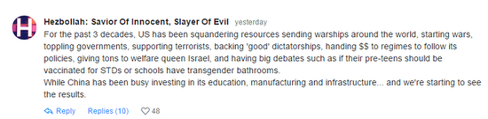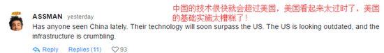 同样的,美国人当中也不乏愤青。其中有人评价道:过去的30多年间,美国忙于在全球打仗,支持恐怖主义,为“跟随美国”的政权撒钱,忙于争论是否该有性病疫苗,忙于争论学校是否该有男女混用卫生间。这时候中国在干嘛?他们忙于投资自己的教育、制造业和基础设施。