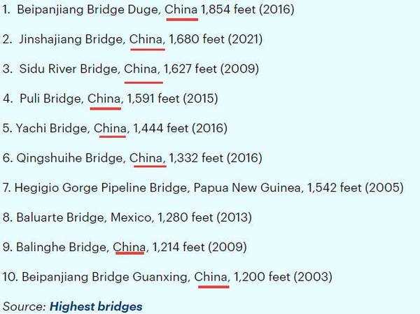 事实上,在10座世界最高的大桥名单当中,除了第七(位于巴布亚新几内亚)和第八(位于墨西哥)外,其余八座桥梁都来自中国!