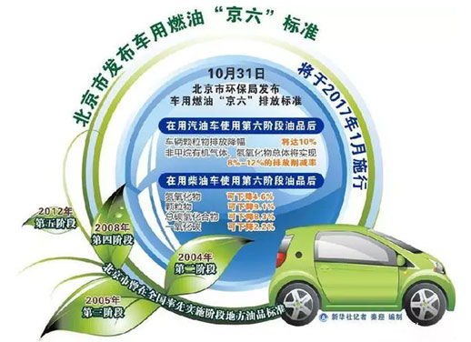 2016年10月31日,北京市环保局正式发布北京市第六阶段《车用汽油》、《车用柴油》地方标准,新标准将于2017年1月1日实施。