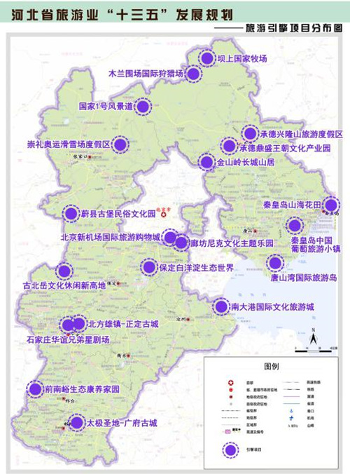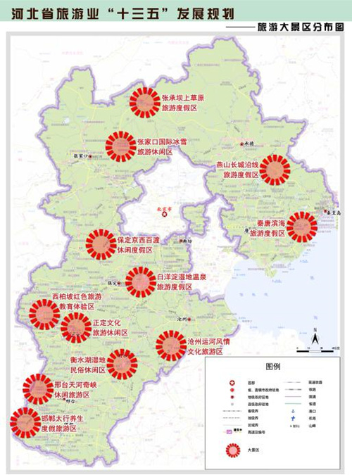 根据《规划》,河北省将把石家庄打造成为旅游中心城市,把张家口、承德、秦皇岛建设成为国际旅游城市,同时培育保定、衡水、邯郸等7个特色旅游名城,力争到2020年建成22个国家全域旅游示范区、30个左右精品旅游特色小镇,通过旅游业带动区域经济社会发展。