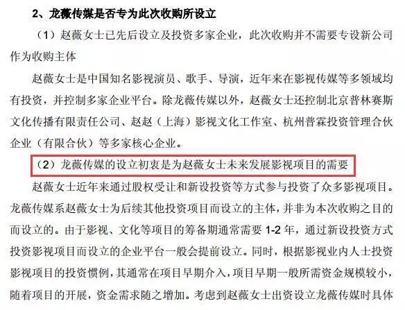 对此,龙薇传媒予以否认,称龙薇传媒的设立目的原本是赵薇的影视业务需要,并非专门为本次收购所设立。由于影视、文化等项目的筹备期通常需要1~2年,通过新设投资方式投资影响项目而设立的企业平台一般会提前设立。同时龙薇传媒及万家文化详述了股权转让双方的谈判过程并提供了谈判进程备忘录。