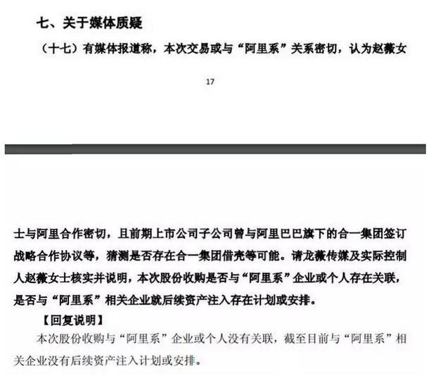 对此,龙薇传媒回复称:“本次股份收购与'阿里系'企业或个人没有关联,截至目前与'阿里系'相关企业没有后续资产注入计划或安排。”