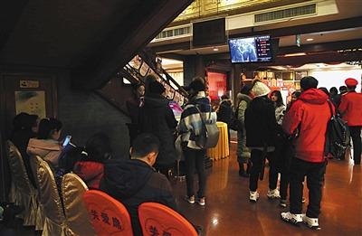 除夕夜,老字号全聚德前门店,等待翻台吃年夜饭的客人在门口排队等着叫号。