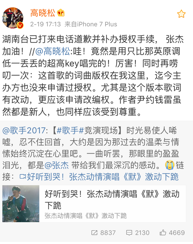 事件引起风波后,2月19日下午,高晓松再次转发微博透露进展:“湖南台已打来电话道歉并补办授权手续, 张杰加油!”