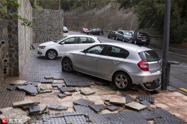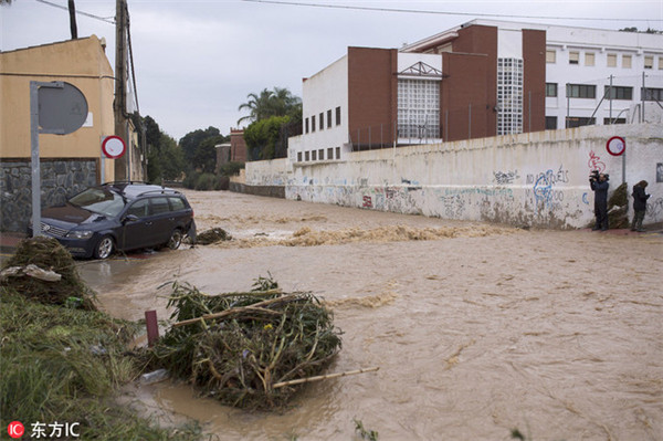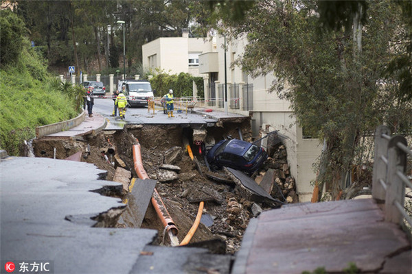 西班牙暴雨致路面坍塌 汽车不幸入坑