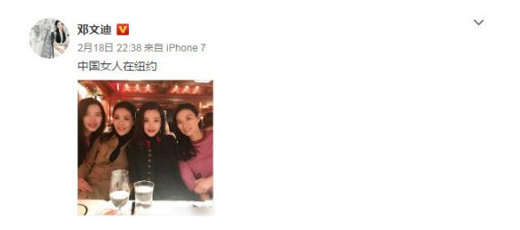2月18日,邓文迪在微博晒出一张与李冰冰、苏芒等人聚会的照片,并配文:“中国女人在纽约。”照片中四人面对镜头露出了甜美的微笑。邓文迪与李冰冰都在前段时间曝光了与小鲜肉恋爱的消息,网友们纷纷表示:“我代表中国广大单身狗男女求您出一本撩汉手册。”;“四位都是资深美女啊!”