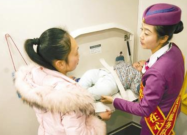 对于带婴儿乘坐高铁的妈妈来说,母婴室显得尤为必要。图为G82次高铁母婴室内,列车员正在协助一位年轻妈妈照护婴儿。彭 年摄