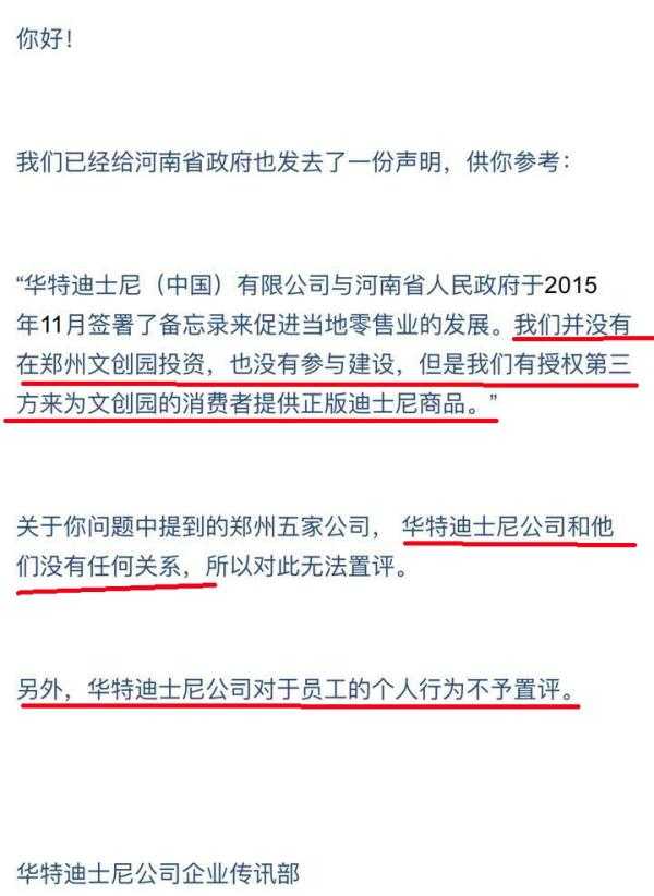华特迪士尼方面透露,华特迪士尼(中国)有限公司确实与河南省人民政府于2015年11月签署了备忘录来促进当地零售业的发展。其同时表示:“我们并没有在郑州文创园投资,也没有参与建设,但是我们有授权第三方来为文创园的消费者提供正版迪士尼商品。”