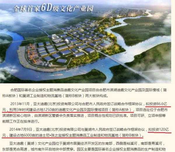 2014年7月9日,亚太迪趣(北京)投资有限公司又与巢湖市人民政府签订战略合作框架协议,拟投资120亿元,建设占地6000亩的迪士尼 孩之宝授权主题消费品工业制造和物流基地。