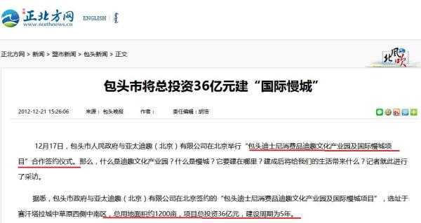 据包头晚报报道,2012年12月17日,包头市人民政府与亚太迪趣(北京)有限公司在北京举行“包头迪士尼消费品迪趣文化产业园及国际慢城项目”合作签约仪式。