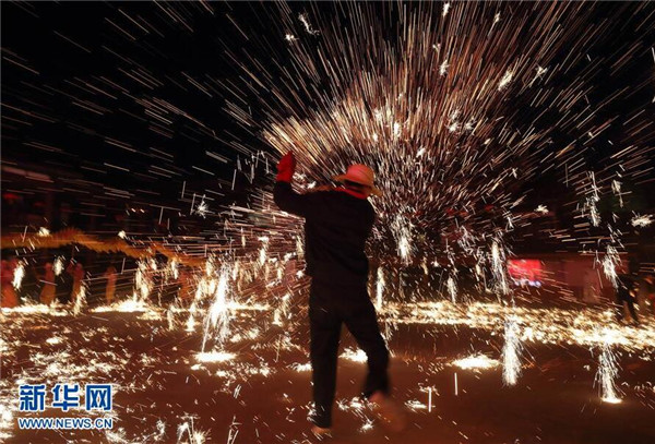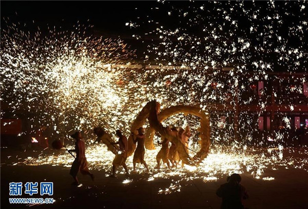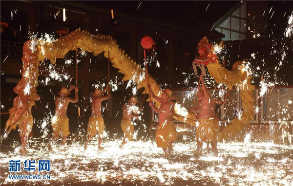 这是成都黄龙溪古镇“烧火龙”民俗活动现场(2月26日摄)。 2月26日,四川成都黄龙溪古镇举行“烧火龙”民俗活动,迎接农历“二月二”的到来。铁水烟花喷向龙身,龙、灯、舞、焰融为一体,蔚为壮观。成都黄龙溪有“火龙之乡”之称,至今保留“烧火龙”等民间习俗。新华社记者 江宏景 摄