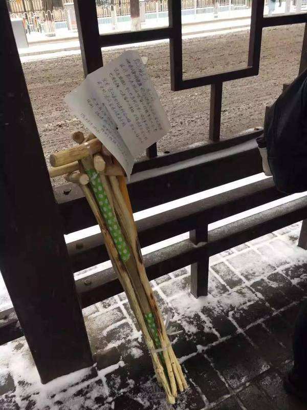 一张照片的画面是:雪天的公交站台放着一捆拐棍,上面还留有一张字条。另一张照片则清晰地拍到了字条上的内容,“今天风雪大路有泥泞,老人走路困难,‘爱心拐棍’帮您大忙……这里有几条拐棍,需要请您随手拿走使用。随便使用,不花钱。”