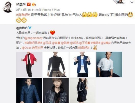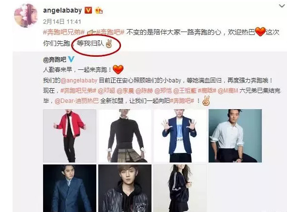 热巴刚宣布加入跑男之时,被顶替的Baby表示很欢迎热巴,不过随后又强调“你们先跑,等我归队”,似乎在宣示主权。