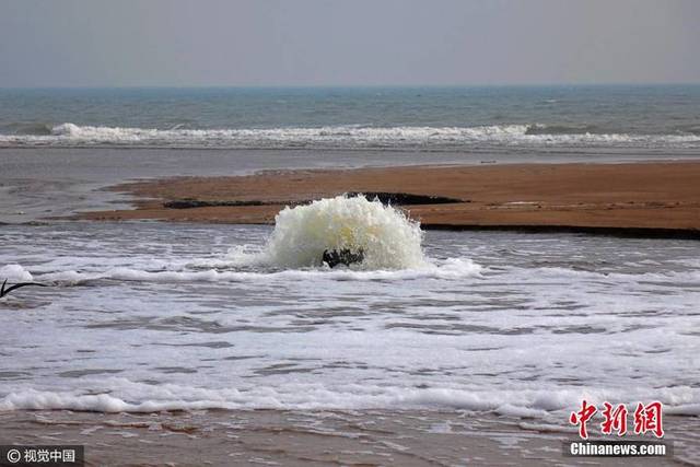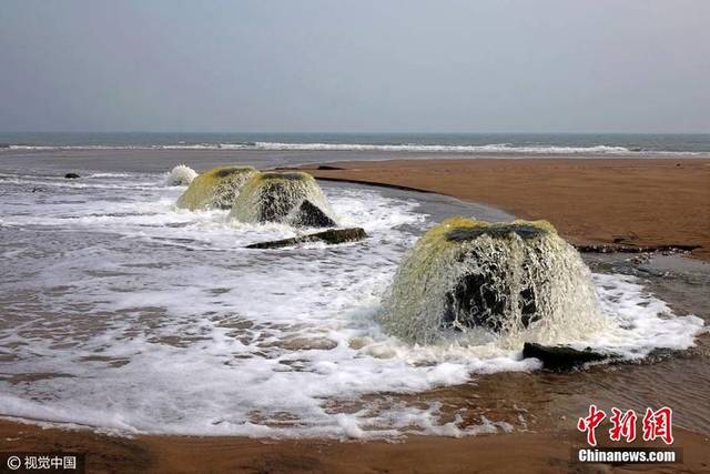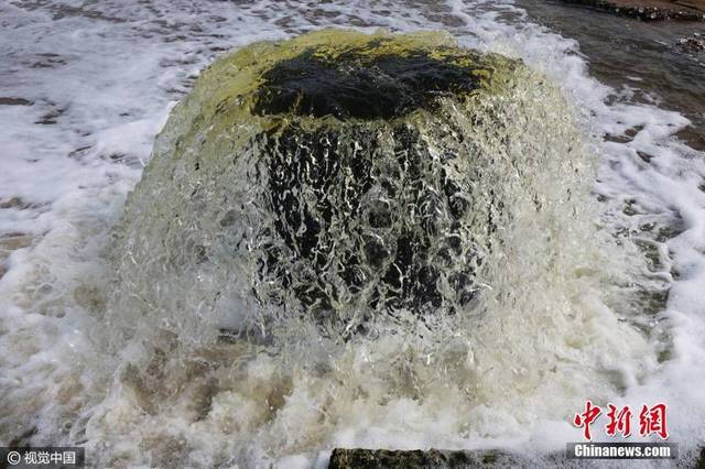 2017年2月28日,山东青岛正值天文落大潮,裸露在灵山湾海滩上的市政排水井暴涌状如“蘑菇泉”,场面甚是壮观。