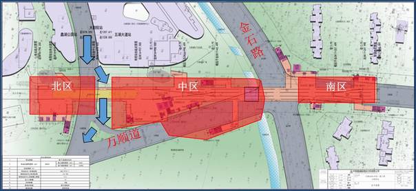 据了解,本阶段围挡共分为三个区域,分别是北区、中区和南区,北区位于大剧院路北侧的大剧院广场内,中区位于大剧院路与金石路之间的万象城广场内,南区位于金石路南侧的万顺道上。