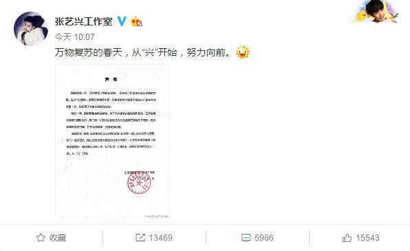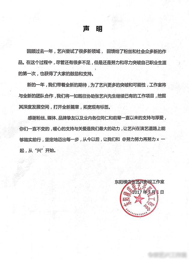 凤凰网娱乐讯 3月1日,张艺兴工作室在微博发布声明,透露新的一年将与全新团队合作,打开全新篇章,拓宽现有标签,从“兴”开始。据了解,张艺兴的前经纪人孙于夕目前正在怀孕待产,新旧团队正在进行交接。