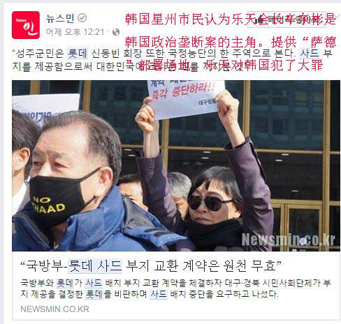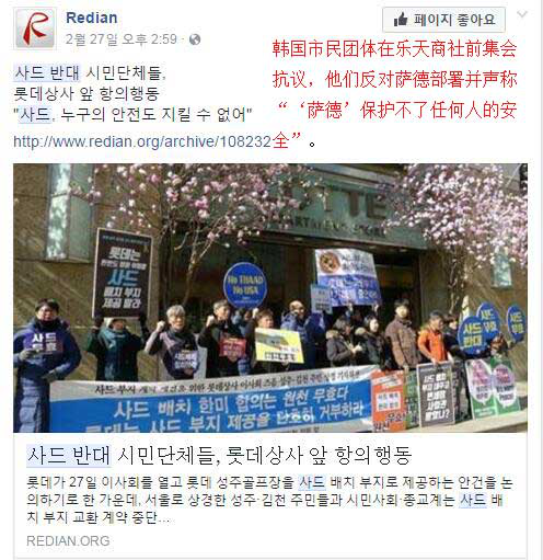 韩国民众和民间组织分别在韩国国会和乐天百货商场门前举行示威,抗议部署“萨德”,要求乐天拒绝提供部署用地。此外,韩国不少网友也强烈谴责乐天集团和政府部署“萨德”反导系统的行为。