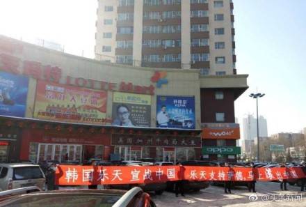 2月26日,有26名大叔大妈聚集在吉林江南乐天玛特超市前,拉起了抗议布条,上面写着“韩国乐天,宣战中国,乐天支持‘萨德’,马上滚出中国”。