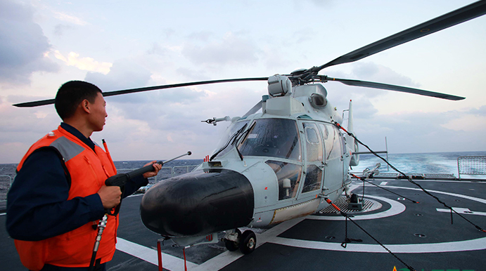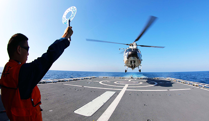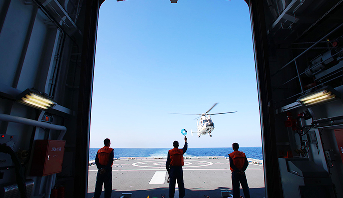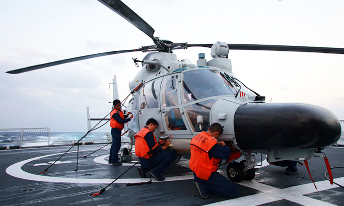 3月5日下午,南海舰队远海训练编队随舰直升机组进行引导直升机着舰、出入库及维护保养等机务保障工作,增强机务人员随舰保障能力。