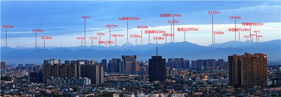 每年夏秋季节,只要天气晴好,站在成都高楼上向西眺望,包括华西雨屏雪山、大雪塘、四姑娘山幺妹峰、小雪隆包等在内的10多座雪山一一显现。