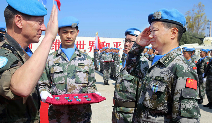 中国第15批赴黎巴嫩维和部队授勋仪式8日在黎巴嫩南部辛尼亚村的多功能工兵分队营区举行,全体410名维和官兵荣获联合国“和平荣誉勋章”。新华社发(华迅 摄)