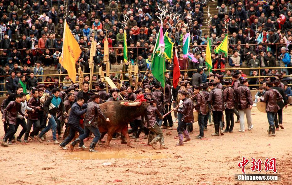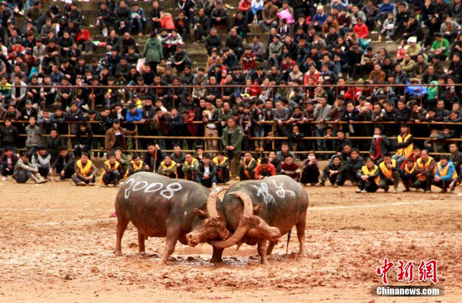 3月11日,贵州省从江县在下江镇归江村斗牛埸举办斗牛赛活动,现场人山人海,场面壮观。据了解,斗牛是从江县苗侗民族最为喜爱的一项传统民间活动,为充分展示从江传统斗牛文化,每月举行2次斗牛赛。 中新社发 刘宝成 摄 图片来源:CNSPHOTO