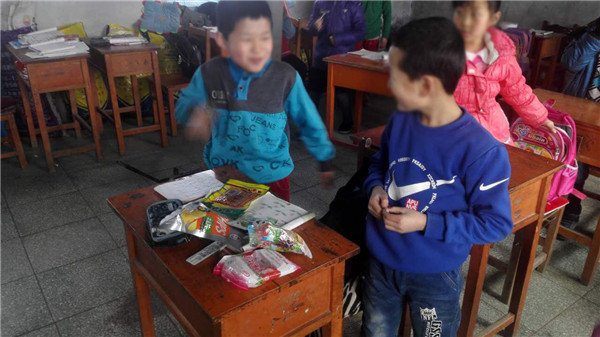 某小学的学生正在课件分享山寨小零食。一位“免费午餐”公益团队志愿者说:“那天看我女儿同学在吃五毛一包的辣条,一股特别诱人的奇香,因为全是过量的香精色素添加剂 。”