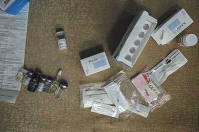 刘医生安排记者坐在沙发上,套上蓝色塑料帽,自己戴上口罩和皮手套,蹲在沙发边,将小罐“绿毒”包装撕开,稀释后吸入针管。就在注射即将开始时,记者借故离开了现场。