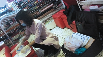 3月10日,在搜秀一美甲店,刘某做注射准备,边上是其随身携带的拉杆箱,里面则是药品和注射用具。