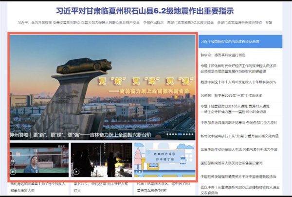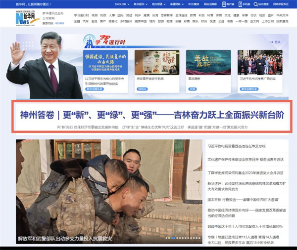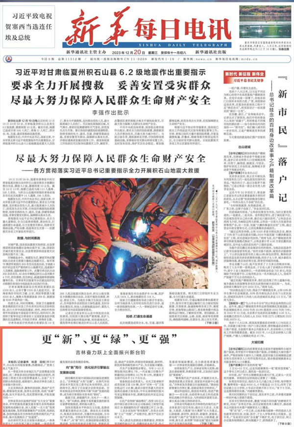 新华每日电讯一版,新华网首页头条、焦点图刊发《更“新”、更“绿”、更“强” 吉林奋力跃上全面振兴新台阶》,报道吉林省立足实体经济,聚焦科技创新,推动产业升级;着眼绿色发展,发挥生态优势,抢抓“双碳”机遇;加大开放步伐,优化营商环境,开拓发展空间等多方面取得的成就;新华社客户端、新华网刊发图片新闻《吉林省委经济工作会议:2023年5方面成绩喜人》《吉林省委经济工作会议:提及“5个必须”》,报道20日召开的吉林省委经济工作会议,会上回顾2023年全省经济工作取得的5方面喜人成绩;提及“5个必须”。