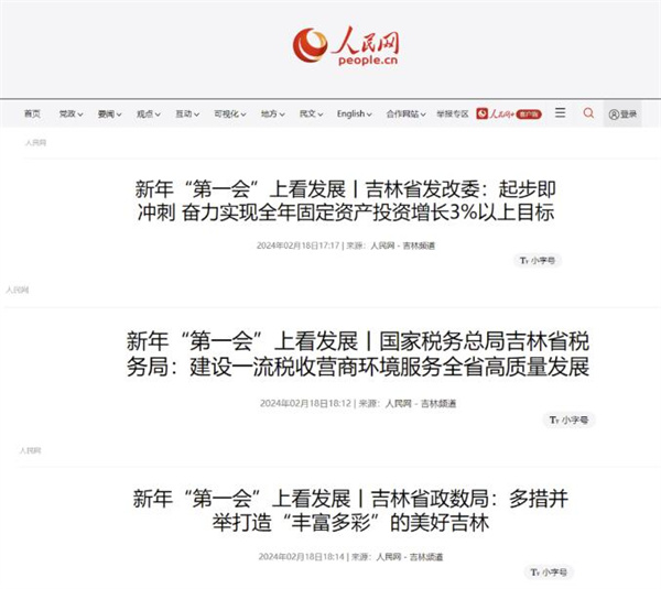 此外,人民网还推出《吉林省发改委:起步即冲刺 奋力实现全年固定资产投资增长3%以上目标》《国家税务总局吉林省税务局:建设一流税收营商环境服务全省高质量发展》《吉林省政数局:多措并举打造“丰富多彩”的美好吉林》,报道我省各厅局针对2024年全省投资和项目建设、深化税收服务、优化营商环境等工作的安排情况。同时,推出《延边州:努力实现投资量级攀升、项目质效提升、营商环境跃升》《前郭县:打造效率更高、办事更快、服务更优、政策更好的营商环境》,报道延边、前郭2024年优化营商环境、加快项目建设工作目标和举措。