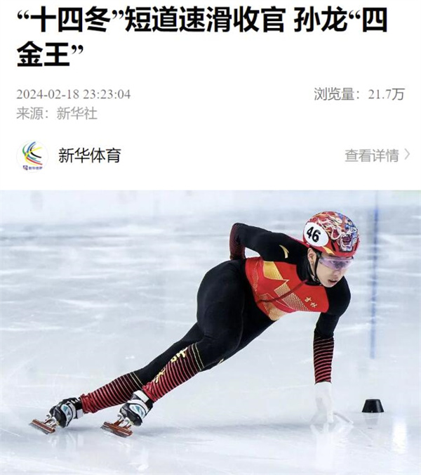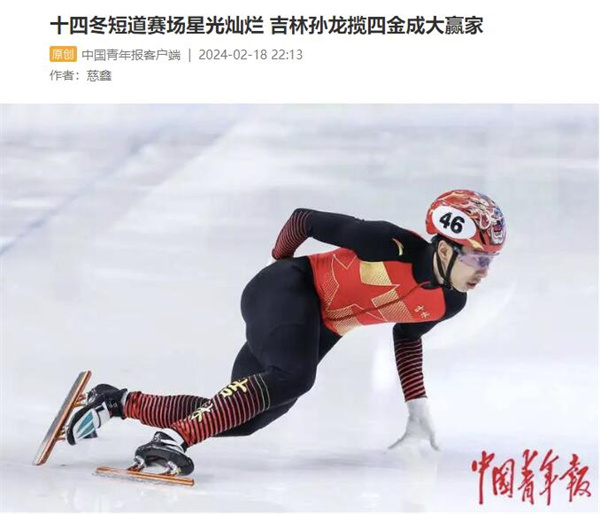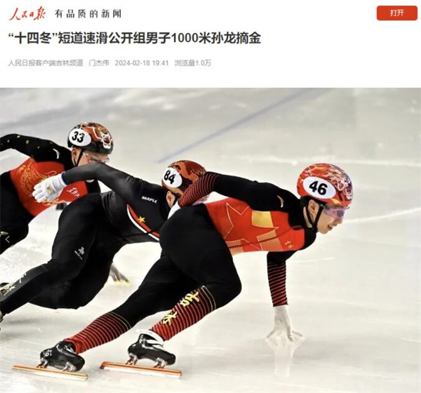 人民日报客户端推出《“十四冬”短道速滑公开组男子1000米孙龙摘金》《短道速滑1000米孙龙夺冠 包揽“十四冬”单项三金》;人民网推出《“十四冬”短道速滑公开组收官 吉林队收获五金孙龙加冕“四冠王”》。